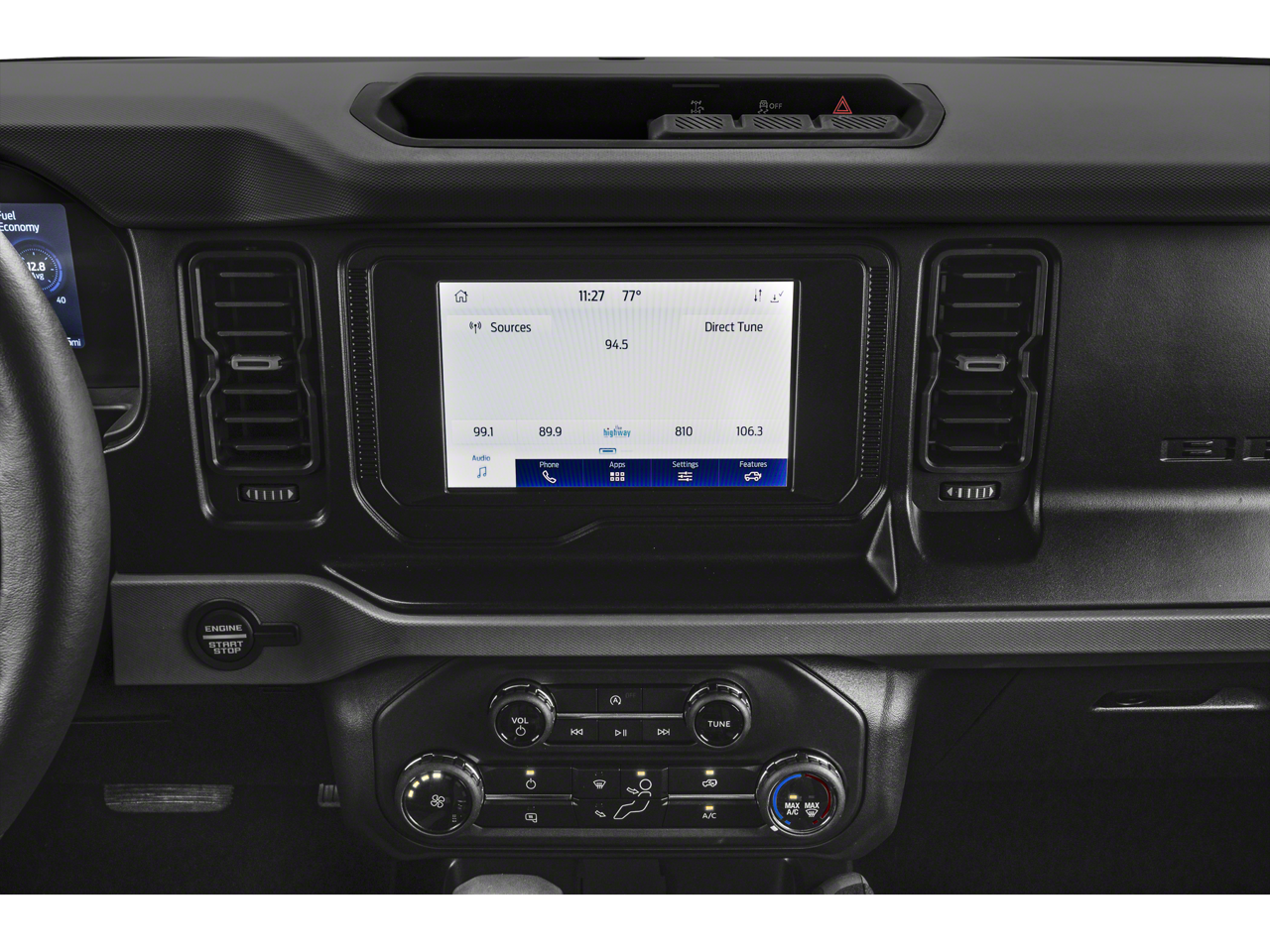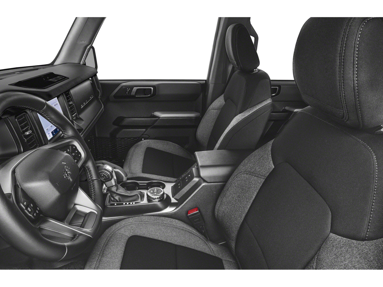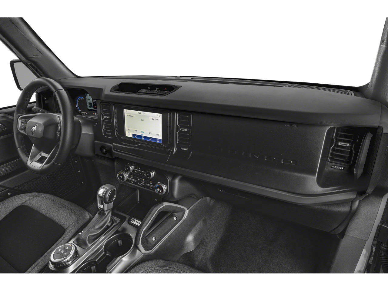 2-Door Intelligent Access w/Lock/Unlock, 4-Wheel Disc Brakes, 4.46 Axle Ratio, 7 Speakers, ABS brakes, Air Conditioning, Alloy wheels, AM/FM radio: SiriusXM with 360L, AM/FM Stereo, Ambient Footwell Lighting, Auto High-Beam Headlamps, Auto High-beam Headlights, Auto-Dimming Interior Rear-View Mirror, BLIS Blind Spot Information System, Brake assist, Compass, Connected Navigation, Delay-off headlights, Dr & Pass Illuminated Sliding Visor Vanity Mirrors, Driver door bin, Driver vanity mirror, Dual front impact airbags, Dual front side impact airbags, Dual-Zone Electronic Automatic Temperature Control, Electronic Stability Control, Emergency communication system: 911 Assist, Enhanced Voice Recognition, Equipment Group 222A Mid Package, Exterior Parking Camera Rear, Ford Performance Heavy-Duty Modular Front Bumper, Front anti-roll bar, Front Bucket Seats, Front Center Armrest, Front fog lights, Front reading lights, Front Row Heated Seats, Front wheel independent suspension, Fully automatic headlights, Heated door mirrors, Illuminated entry, Integrated roll-over protection, Lane-Keeping System, Leather Shift Knob, LED Signature Lighting, Low tire pressure warning, Marine Grade Vinyl Bucket Seats, Occupant sensing airbag, Outside temperature display, Overhead airbag, Overhead console, Panic alarm, Passenger door bin, Passenger vanity mirror, Powder Coated Tube Step, Power door mirrors, Power Outlet - Back Side of Center Floor Console, Power steering, Power windows, Pre-Collision Assist w/Automatic Emergency Braking, Radio data system, Radio: 6 Speakers w/Subwoofer Delete, Rear Parking Sensors, Rear-View Camera, Remote keyless entry, Remote Start System, Security system, SiriusXM Radio w/360L, Speed control, Split folding rear seat, Steering wheel mounted audio controls, SYNC 4, Tachometer, Telescoping steering wheel, Tilt steering wheel, Traction control, Trip computer, Variably intermittent wipers, Wheels: 17" Carbonized Gray-Painted Aluminum.